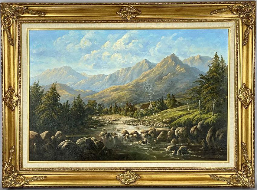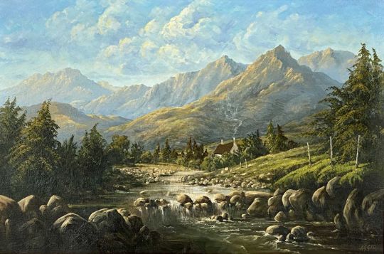 OLGA AGGIO (Australian b. 1943) oil on canvas - riverside cottage with mountain beyond, inscribed to stretcher 'Wood smoke, Welsh border, Capel Curig near Snowdon', signed lower right, 50 x 75cmsProvenance: private collection ConwyComments: framed and glazed