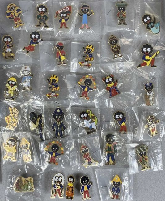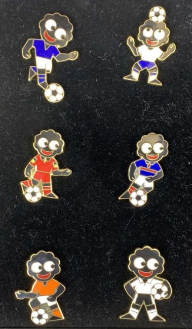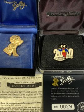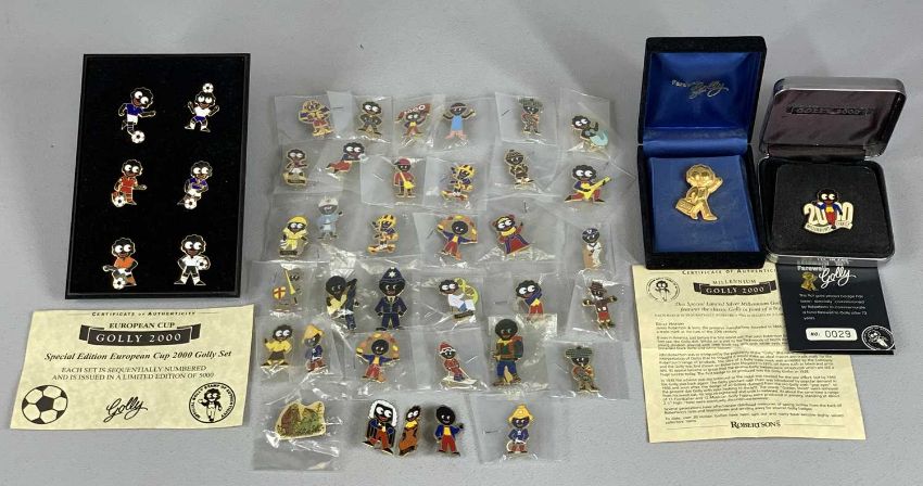 COLLECTION OF ROBERTSONS ADVERTISING ENAMEL BADGES including 40 individual in bags, special edition European Cup 2000 set, silver Millenium 2000 badge and limited edition no. 29 gold plated Farewell badgeProvenance: private collection LancashireN.B. Originally handmade by mothers in Africa for their children from old fabric and cloth, the golly doll was adopted as the mascot and trademark for the Robertson's confectionery brand around 1910 after the company's founder John Robertson visited the US and noticed children playing with them. Robertson's Gollies have been collected by people across the UK and around the world for generations but garnered a contentious image in the 1980s. The trademark was removed from Robertson's branding in 2001. These items are listed on the basis they are illustrative of a by-gone culture, but we believe that providing transparent information about historical context fosters greater understanding of our complex cultural history.