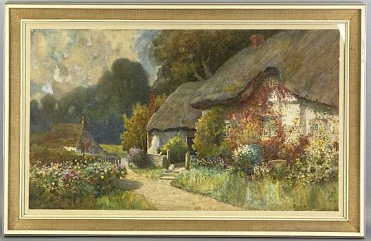 GEORGE HUGHES (British 1894 - 1909) watercolour - thatched cottage with figure leaning against wall with cat beside, 40 x 68cmsProvenance: private collection Conwy