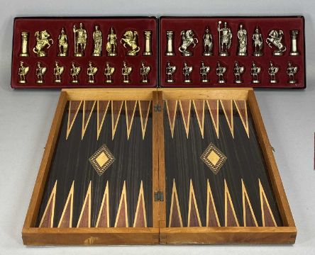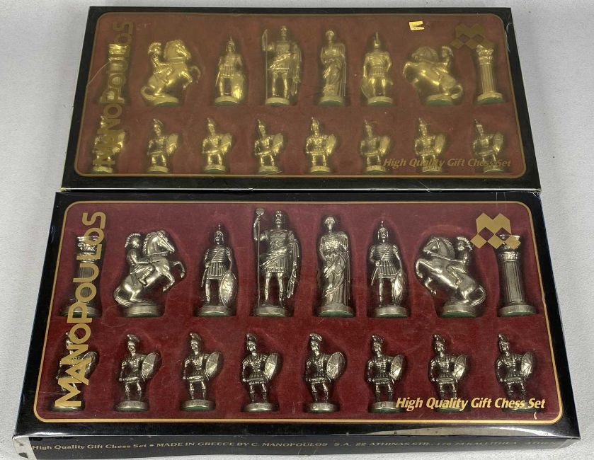 MANOPOULOS, two boxed set of chess pieces with wooden folding games board and a vintage doll 'Rosebud'Provenance: private collection Denbighshire