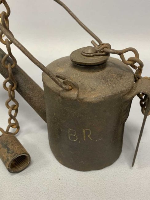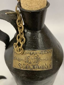 VINTAGE RAILWAY COLLECTABLES including LNWR window strap and attachment, GWR oil can, BR oil can, a shunter's hook and a Scout knife in leather scabbardProvenance: private collection Denbighshire