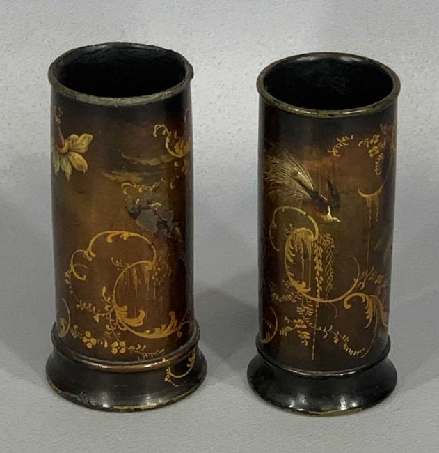 VICTORIAN LACQUERED PAPIER-MACHE including large oval tea tray painted with a fox hunting scene, 50 x 62cms, blotter folder inlaid with mother of pearl and gilded with oriental scene, 23 x 30.5cms, desk stand inlaid with mother of pearl, 28cms (w) and pair of spill vases painted with flowers, 12.5cms (h)Provenance: private collection Denbighshire