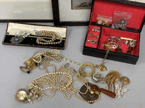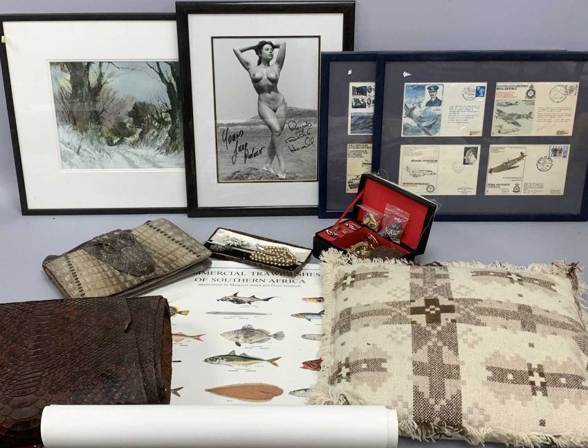 GROUP OF MIXED COLLECTABLES including Air Force First Day Covers, beige and brown Welsh blanket cushion, small selection of costume jewellery and a crocodile skin handbag, etcProvenance: private collection Ynys Mon