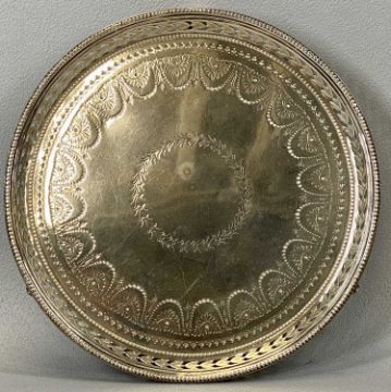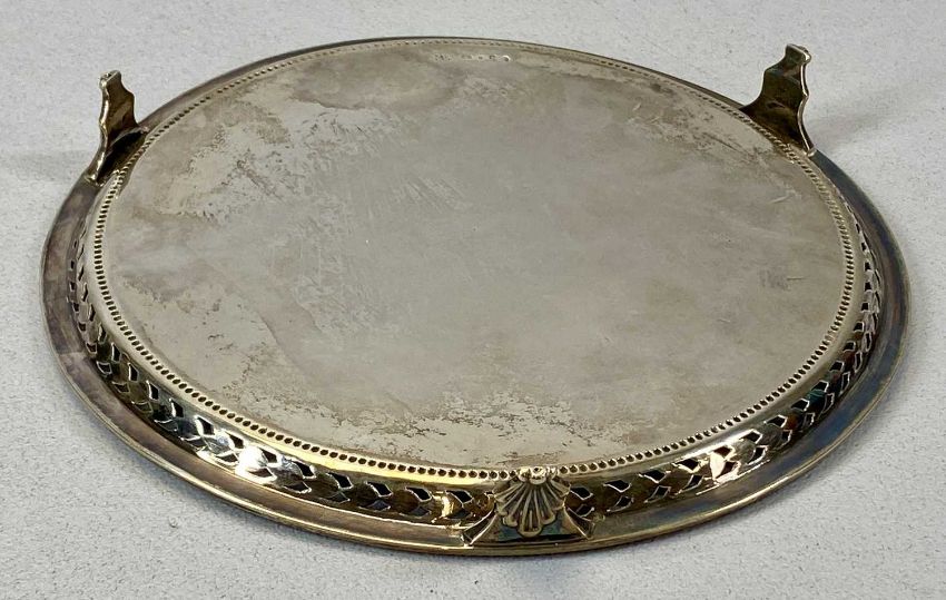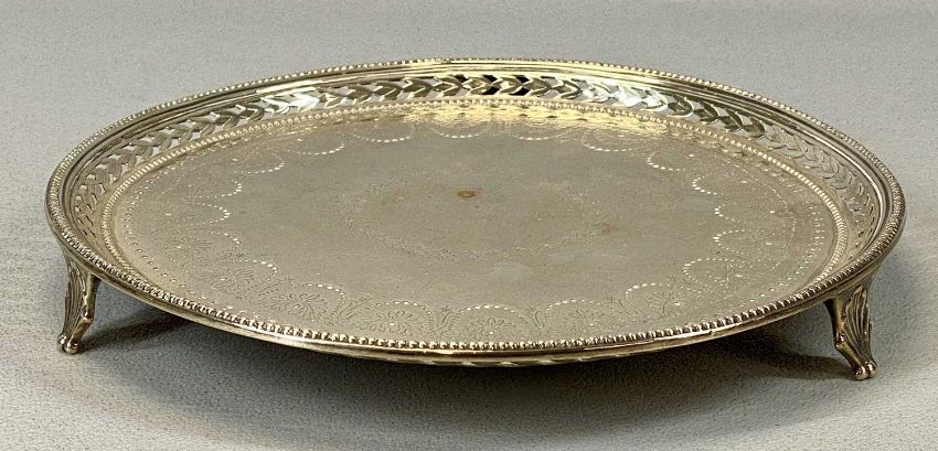 CIRCULAR SILVER CARD TRAY with beadwork rim, pierced border, chased decoration on shell cast feet, London 1880, Thomas Bradbury & Sons, 21cms (diam), 7.25ozsProvenance: private collection Denbighshire
