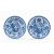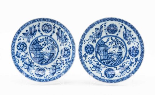 PAIR CHINESE BLUE & WHITE DISHES, 18th C, painted with central cusped roundel of boy on a pavilion terrace, within medallion, antiques border and diaper rim, 22.5cms (diam) (2)Provenance: consigned from CardiffComment: both chipped footrims, one with crack.
