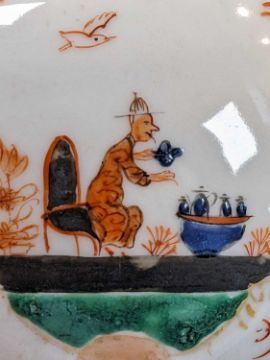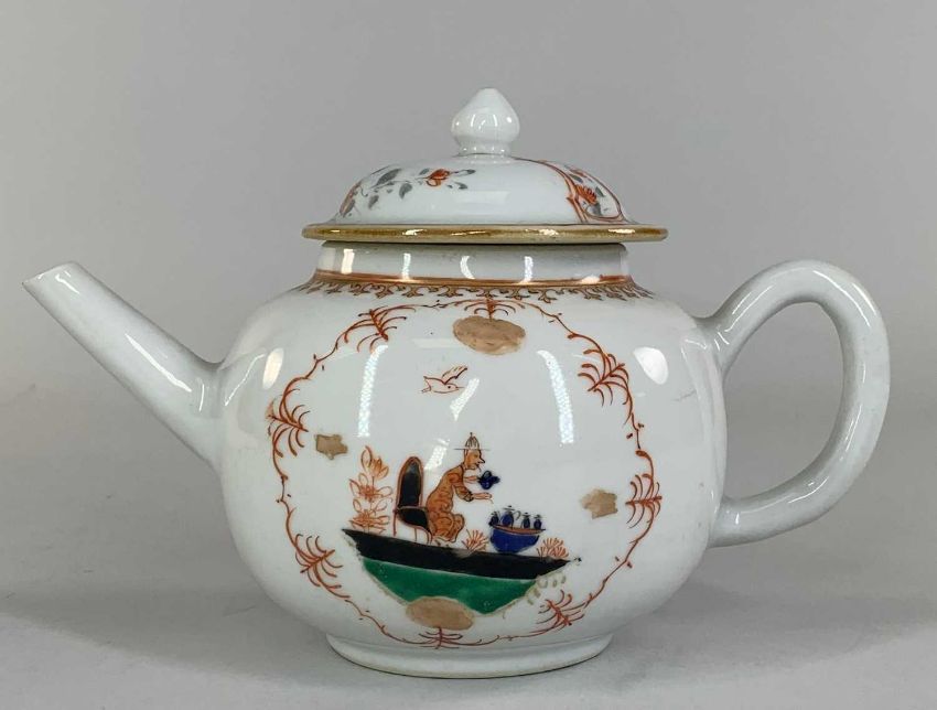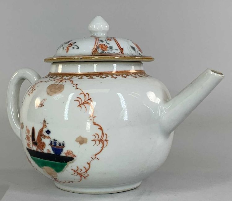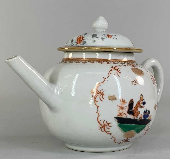 CHINESE EUROPEAN-SUBJECT FAMILLE VERTE TEAPOT & COVER, 18th C., of bullet form, decorated in the Meissen-style with a seated figure at a tea table within iron red shaped borders, 20cms (w)Provenance: private collection south WalesComments: good overall