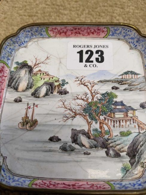 TWO CANTON ENAMEL SPOON DISHES, Qianlong, one European-subject with figures at a picnic feeding a parrot on a perch in a tree, the other with a conventional river landscape with two junks at anchor, both with 2-character marks, 9.6cms (w) (2)Provenance: private collection north WalesComments: cracks and chips to both, see images.