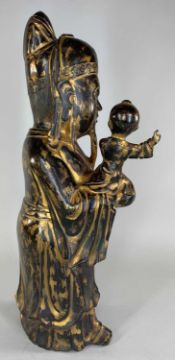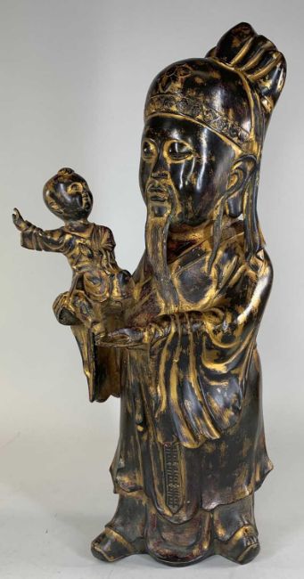 CHINESE BRONZE FIGURE OF LUXING, 20th Century, in flowing robes holding a gesturing child, traces of gilt, 52cms (h)Provenance: consigned from Rhondda Cynon TafComments: overall good