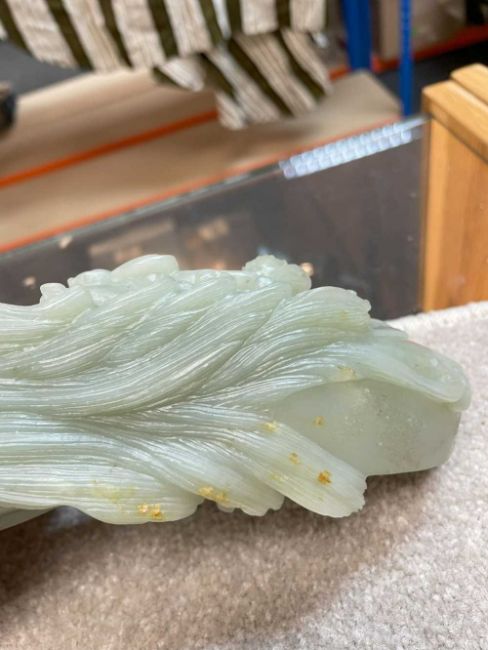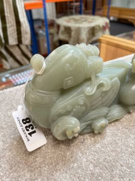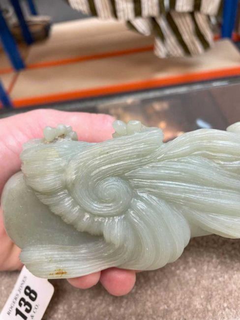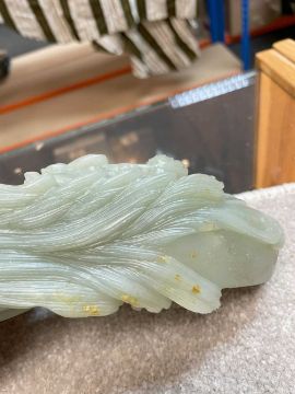 CHINESE CELADON JADE CARVING OF MANDARIN DUCKS, late Qing Dynasty, swimming on a pond with stems of lotus flowers in their beaks, even tone with small brown inclusions on the high points of the waves, 20.7 x 7 x 8.5cmProvenance: private collection SwanseaComments: minor abrasions only.