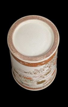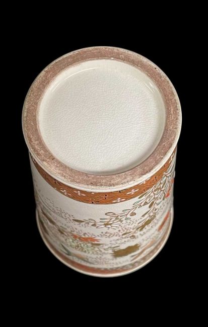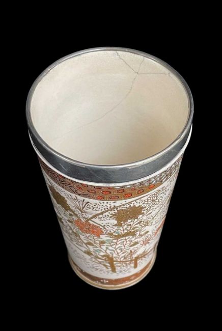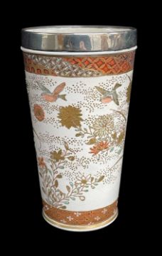 JAPANESE SILVER-MOUNTED SATSUMA BEAKER, Meiji period, with silver rim hallmarked for 1886, decorated with chidori flying above flowering kiku, impressed 2-character mark, 14cm hProvenance: Private collection south Wales.Comment: crakcs, breaks and repairs