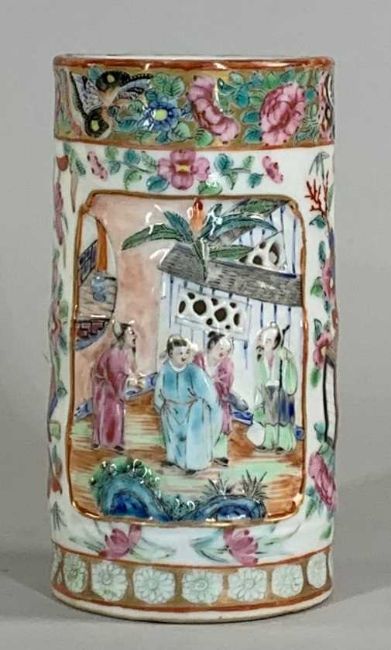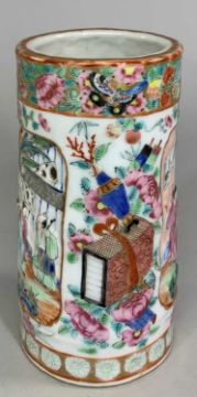CANTON FAMILLE ROSE INCENSE (JOSS) STICK HOLDER, cylindrical form, decorated with two reticulated panels depicting the 'Eight Luohan' on pavillion terraces, precious objects, insects, fruit and floral ground and borders, gilt highlights, 25.8cms hProvenance: private collection GwyneddComments: hairline star crack to base, gilt rubbed.