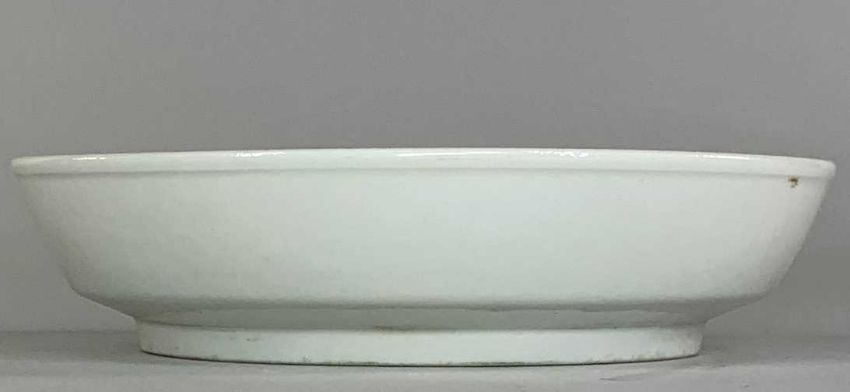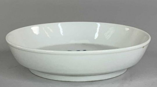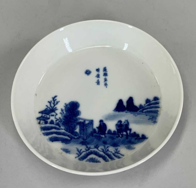 CHINESE BLUE & WHITE DISH, finely painted with scholar with attendant and horse beside a fence and pavillion in a landscape, below 7-character inscription, 'Qian gu liu fang' mark,13.5cms (diam)Provenance: consigned from CardiffComments: overall good