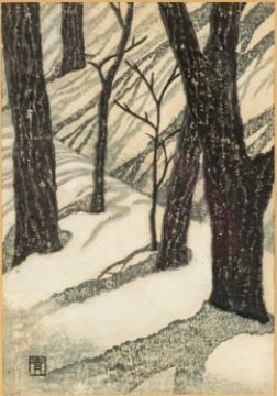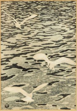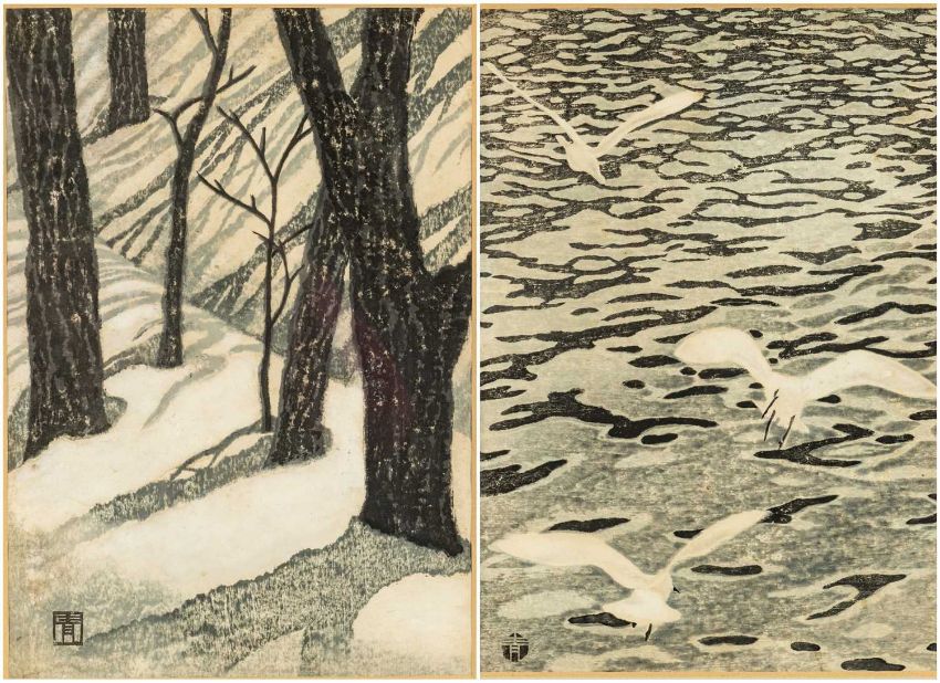 MASAHARU AOYAMA (Japanese, 1893-1969) woodblock prints -'Seagulls' and 'Trees in Snow', signed with red character, 38 x 26cms (2)Provenance: private collection CardiffComments: framed and glazed.