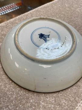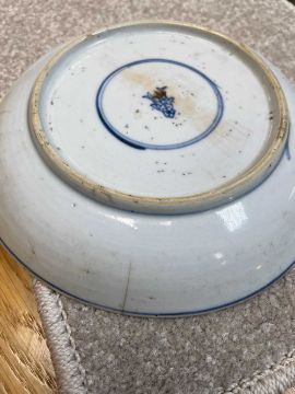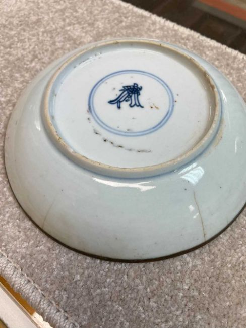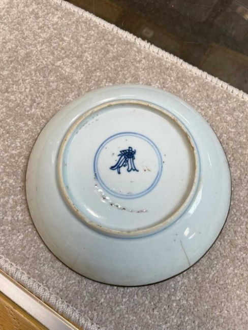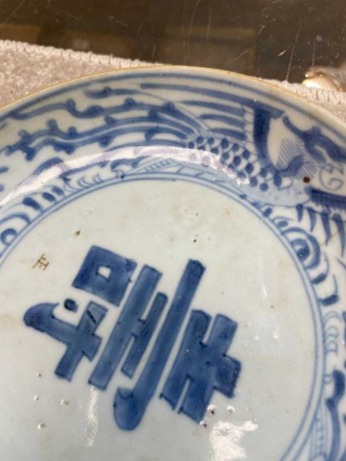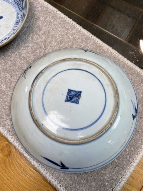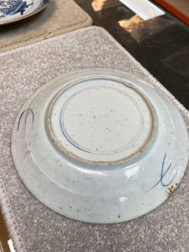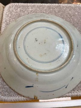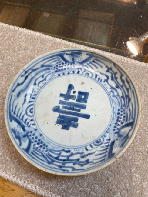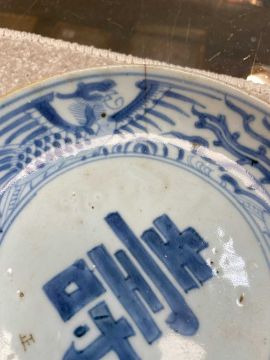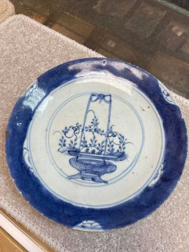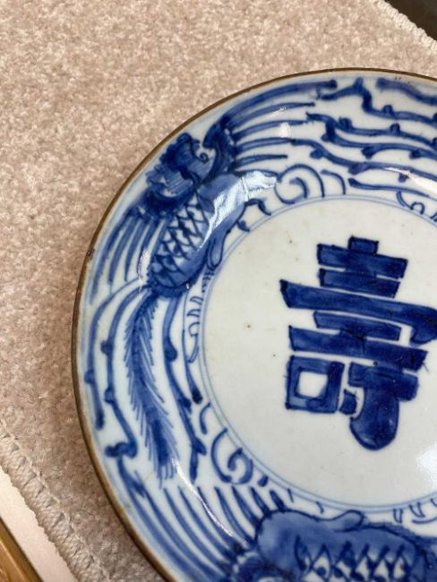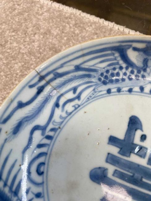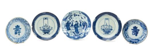 FIVE CHINESE BLUE & WHITE DISHES, comprising 'Sanxing' Star Gods saucer, 19.5cms diam., two 'Shou-character' saucers, 16cms diam., and two 'flower basket' plates, 19cms diam. (5)Provenance: private collection west Wales,Comments: Star Gods dish good, others with chips and cracks.