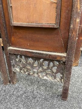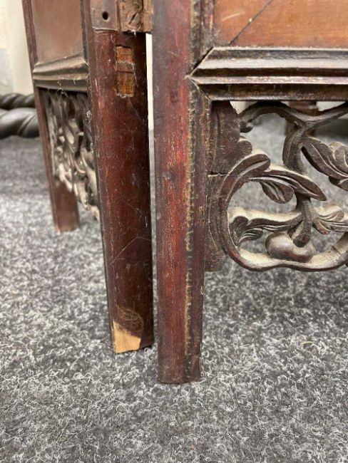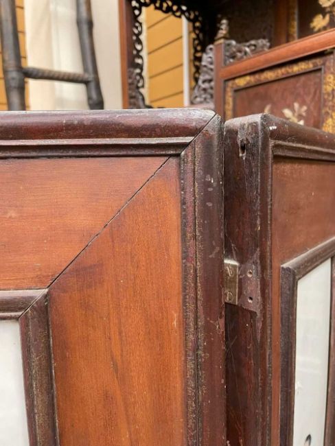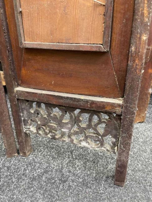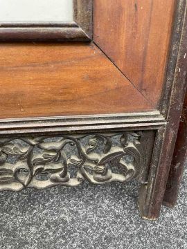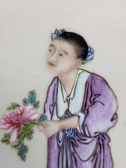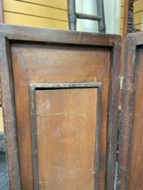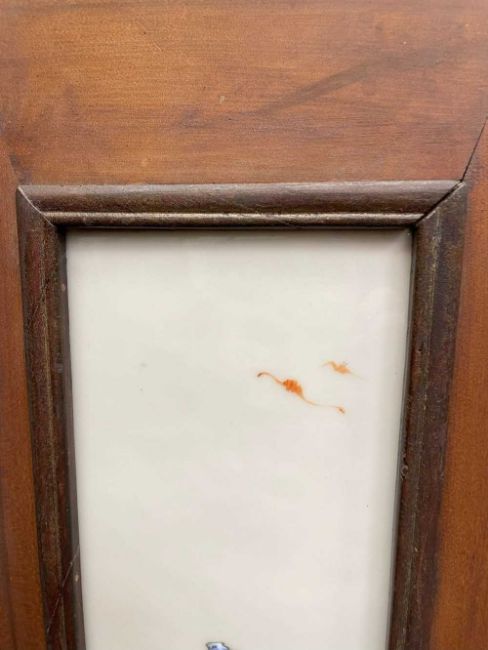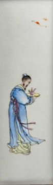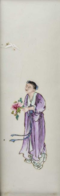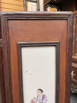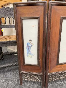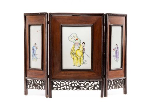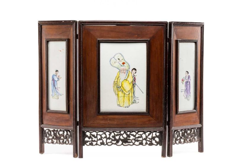 CHINESE PORCELAIN THREE-LEAF 'SHOULAO' TABLE SCREEN, late Qing Dynasty or later, each leaf mounted with famille rose painted plaque depicting Shoulao with attendant holding fan, flanked by two other attendants, one holding a peony beneath flying crane, the other holding bronze jue beneath flying bats, 76cms (h)Provenance: private collection AngleseyComments: pierced elements loose, on panel with small brown iron spot.