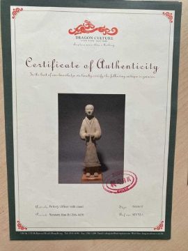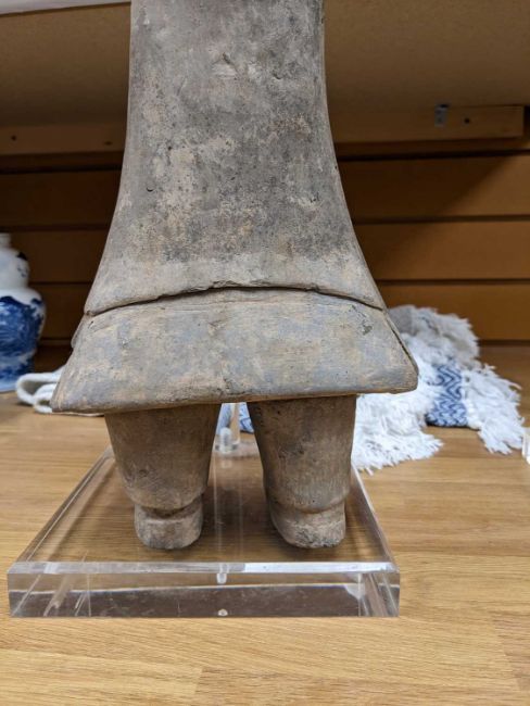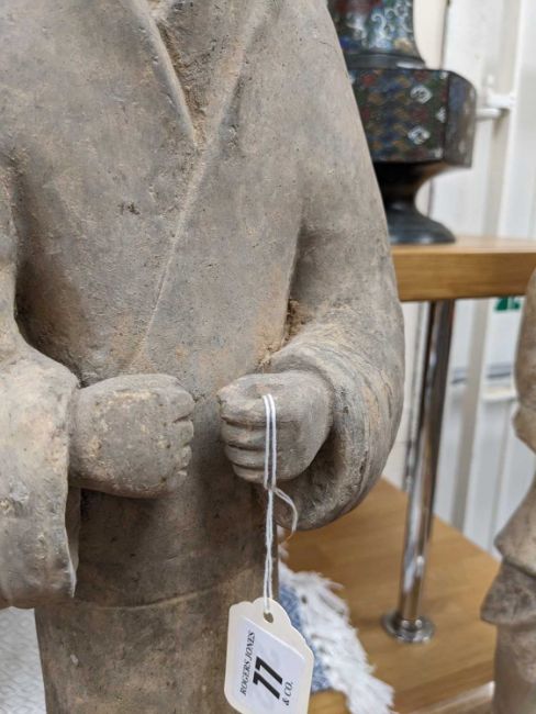 LARGE CHINESE GREY POTTERY FIGURE OF A CIVIL OFFICIAL, Western Han Dynasty (206BC-9AD), standing in flowing robes with hands clasped to the front, 61cms (h)Provenance: Dragon Culture Gallery (Hong Kong) May 2005, private collection Cardiff.Comments: no TL test, perspex stand