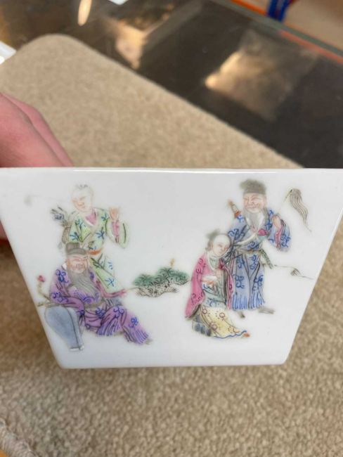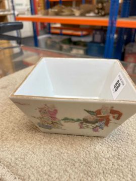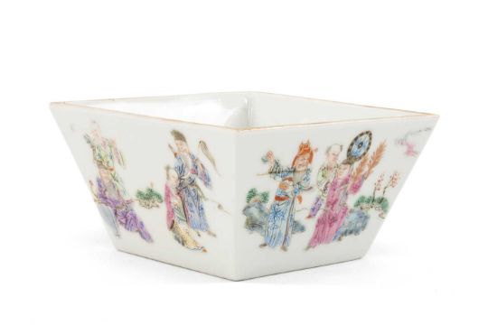 CHINESE FAMILLE ROSE 'IMMORTALS' BOWL, of tapering square form, each side decorated with the eight Taoist Immortals with attendants in a landscape, base with red 6-character Daoguang mark, 10.7cms (w)Provenance: consigned from CardiffComment: overall good with no damage visible.