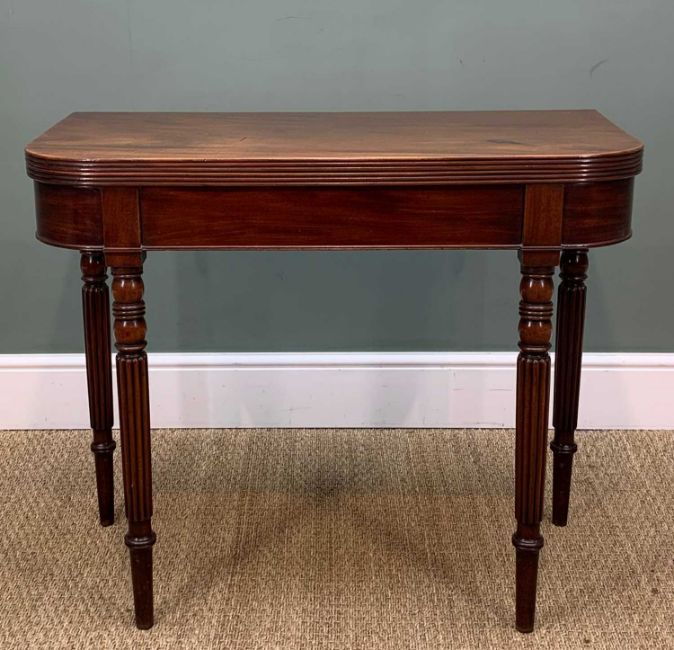 REGENCY MAHOGANY DOUBLE GATELEG TEA TABLE, hinged rectangular top, triple reeded edge, reeded tapering circular legs, 75.5 (h) x 91 (w) x 44.5cms (d)Provenance: private collection CardiffComments: table top slightly warped, stains and scratches, hinges damaged, inspection advised