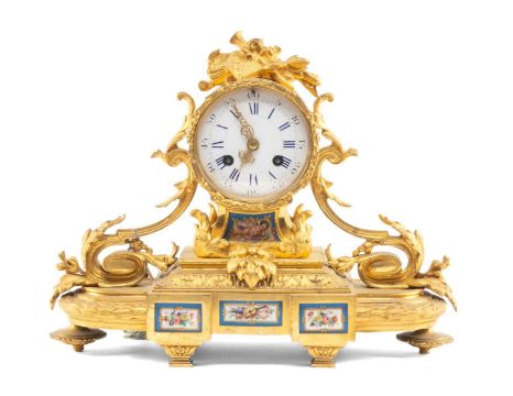 19TH C. FRENCH GILT BRONZE AND PORCELAIN MOUNTED 8-DAY MANTEL CLOCK, drum case with musical surmount, rococo base with acanthus and laurel leaf mouldings, back plate stamped J.L, 30 (h) x 36cms (w)Provenance: private collection PenarthComments: untested, generally good, minor rubbing