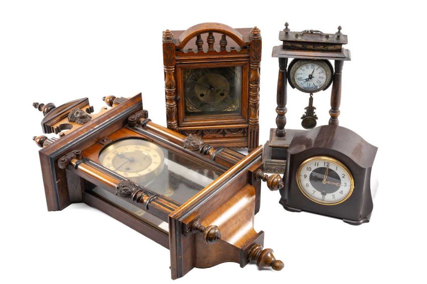 COLLECTION OF CLOCKS including, early 20th c. oak cased clock, 5" brass dial, 35cms (h), German walnut Vienna wall clock, ebonised detail, 75cms (h), Smiths Enfield Bakelite mantel clock, 19cms, (h), modern Portico clock, 38cms (h) (4)Provenance: private collection PenarthComments: Vienna clock damaged lower finials, oak clock with missing finials, untested