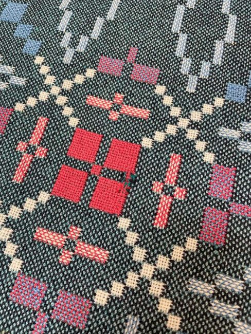 VINTAGE TRADITIONAL WELSH BLANKET with blue and red geometric design on a green ground, corresponding three colour fringe, 206 x 208cmsProvenance: private collection DevonComments: green side faded, few small stains