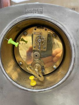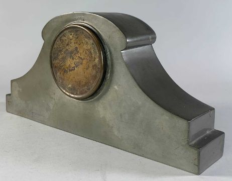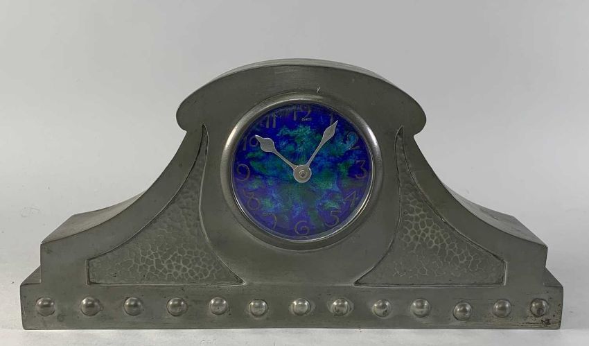 ARTS & CRAFTS CASTLE PEWTER & ENAMEL MANTEL CLOCK, the blue and green circular Arabic dial with shaped hands, in mushroom case with sloping sides, hammered panels and 'rivetted' base, stamped 'Castle Pewter', back plate stamped 'Made in France' and numbered 3***4, 34cms (w)Provenance: private collection Cardiff; thence by descent.Comments: drum case loose (retaining pins missing), ordinary natural tarnish.