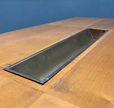ART DECO STYLE BRASS STRUNG DINING TABLE, central brass 'oyster trough', bowed slatted supports spaced with gold painted spheres, 75 (h) x 189 (w) x 90cms (w)Provenance: private consignment PenarthComments: top and base possibly associated, some brass lifting