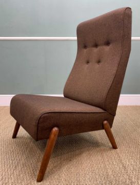 RARE MID-CENTURY ERNEST RACE LOUNGE CHAIR, tall angled buttoned back, low seat, reupholstered dark brown/black fleck material, 100 (h) x 55 (w) x 70cms (d), seat height at front 50cmsProvenance: purchased by the consignees parents in the 60's and remained in family ownership sinceComments: reupholstered 'many years ago and seldom used since' states the vendor which is supported by the fabric condition, very minimal wear but one small moth hole found as pictured, the frame seems to have twisted a little, the front right leg is splayed, all legs with later screws in addition to original fixings