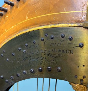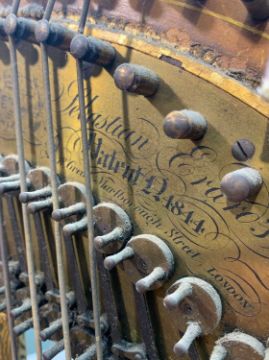 EARLY 19TH C. SEBASTIAN ERARD GRECIAN HARP, patent no.4844, base with 7-pedals, parcel gilt classical moulding to base and capital, 170.5 (h)Provenance: private collection South WalesComments: gilding rubbed, plaster capital with cracks, base with missing sphinx leg, generally worn, strings missing, includes canvas cover