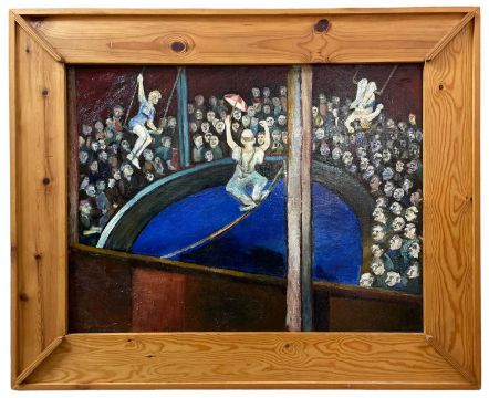 ‡ PETER ARNOLD oil on board - an acrobat balancing on a ball, signed, 89 x 58cms, a circus scene with a lion, acrobats and other figures, signed, 44 x 69cms and another circus themed painting, signed, 55 x 73cms (3)Provenance: direct from the artist studio, deceased estateComments: framed, ready to hang