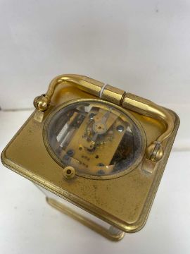GILT BRASS REPEAT STRIKE CARRIAGE CLOCK, Klaftenberger (Paris), white enamel dial with Roman hours and Arabic minutes, signed below the dial, moon hands, platform escapement below oval bevelled glass window, bell strike with repeat push, in corniche case, with swing handle, 14.4cms (h)Provenance: private collection NewportComment: case slightly rubbed