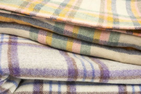 TWO TRADITIONAL WELSH PLAID BLANKETS, wool, woven in purple, blue, grey & caramel 220 x 180cms, and orange, blue, brown, pink & cream 164 x 214cms (2)Provenance: private collection CardiffComments: good overall, inspection advised.