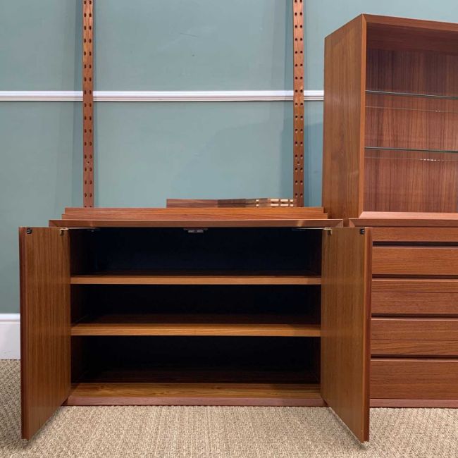MID-CENTURY POUL CADOVIUS 'SYSTEM CADO®' DANISH TEAK MODULAR SHELVING UNIT, three-bay system comprising, two 80cms (w) two-door shelved cupboards, one 80cms (w) four-drawer unit, one 80cms (w) display unit with glass sliding doors and glass shelves, four teak shelves with associated brackets, four uprights 203cms (h), 240 (w) x 48cms (d)Provenance: purchased new by the consignee from Pugh Brothers, Llanelli in the early 70's and remained in private ownership until delivery to our Cardiff showroom, last image as constructed in consignees home, obviously being a modular system the shelves and units can be raised or lowered to suitComments: appears to be in excellent condition with no damage, slight variations in wood tones, one cupboard shelf with non-original pins & pin holes slightly enlarged, there may be the odd light scratch, inspection advised