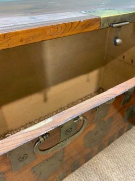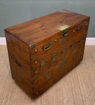 KOREAN ELM CHEST, 20th Century, with brass fittings, upper hinged panel door opening to reveal three internal small drawers, 85.5 (w) x 109 (w) x 49cms (d)Provenance: private collection PenarthComments: overall good, pins holding brass hinges missing, one brass plate loose/partially attached