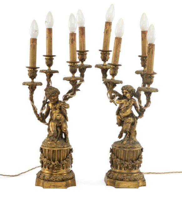 PAIR 19TH C. FRENCH GILT BRONZE FIGURAL 4-LIGHT CANDELABRA, after Claude Michel known as Clodion (1738-1814), modelled as infant Satyr and Bacchus holding branches, on fluted column bases hung with floral swags, height 54cms (2)Provenance: private collection CardiffComments: gilding slightly rubbed, otherwise good. measured height to sconce.