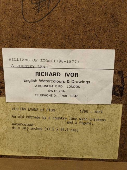 EARLY 19TH C ENGLISH SCOOL, watercolour - An old cottage by a country lane, with chickens and a figure, inscibed 'William Evans of Eton' on 2 Gallery labels verso, 17 x 25.5cmsProvenance: With Richard Ivor; private collection LondonComments: overall good and bright, framed and glazed.