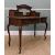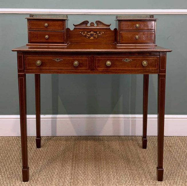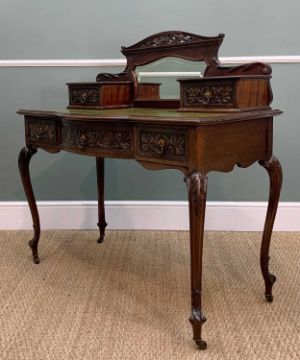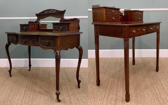 TWO ANTIQUE WRITING DESKS including EWARDIAN SHERATON REVIVAL boxwood strung and marquetry desk, brass galleries, two frieze drawers, tapering square legs, 95 (h) x 84 (w) x 49cms (d), plus CARVED MAHOGANY LADIES WRITING DESK, upper with central mirror flanked by two drawers, green writing leather with tooled edge, three frieze drawers, cabriole legs, 108 (h) x 105 (w) x 51cms (d) (2)Provenance: private collection PenarthComments: Edwardian desk ordinary used condition, some bumps and scratches, ladies desk, repaired split/break to leg, back panel slightly loose, inspection advised