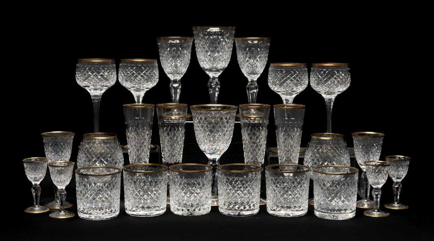 PART SUITE STUART CRYSTAL 'HARDWICKE GOLD' GLASSWARE, including, 10 x liqueur, 10 x sherry, 10 x white, 10 x 'Hock', 10 x red wine, 9 x champagne flute, 6 x cognac glasses, and 10 x whisky/water tumblers (75)Provenance: deceased property PenarthComments: one red wine glass with minor chip to rim, one sherry glass with minor chip to rim, one white wine glass with significant chip to rim