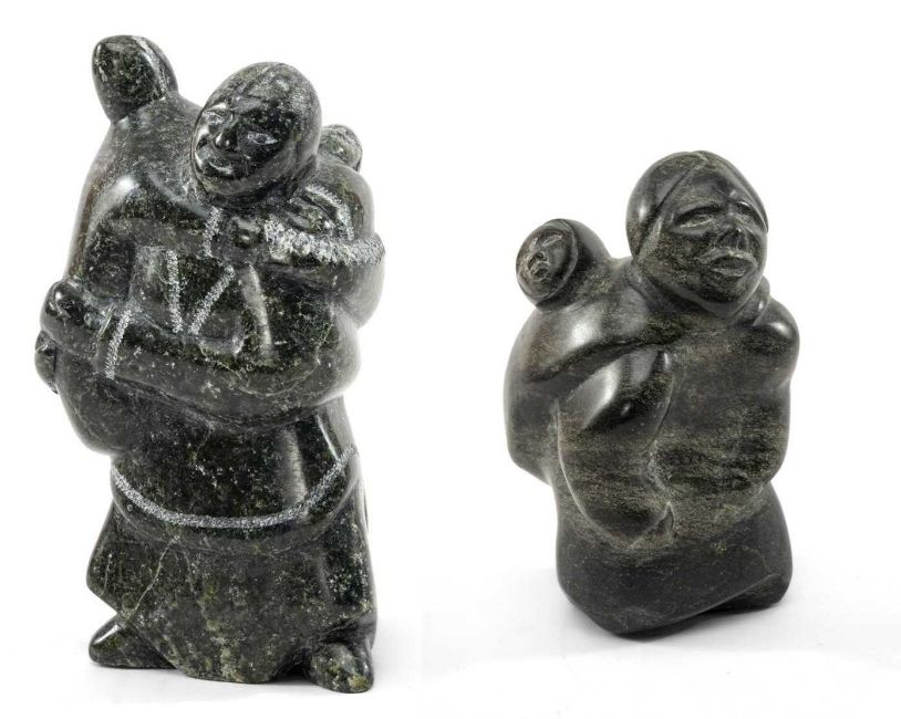 MARY OSHUTSIAQ, green steatite - Mother & Twins, signed in syllabics, Cape Dorset, 2009, 12cms (h) together with, UNIDENTIFIED ARTIST, grey steatite - Mother & Child, signed in syllabics, 16cms (h) (2)Provenance: Private collection Colwyn BayComments: excellent