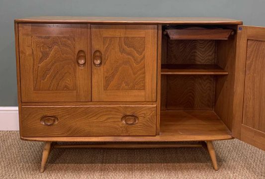 MID-CENTURY ERCOL 467 SIDEBOARD, solid elm sideboard raised on beech underpart, large vertical cupboard with lift-out cutlery tray, two door cupboard with drawer below, 82 (h) x 115 (w) x 49cms (d)Provenance: private collection SwanseaComments: very minor water marks and slight fading, cutlery tray with stains, overall very good and complete with no apparent damage, inspection advised