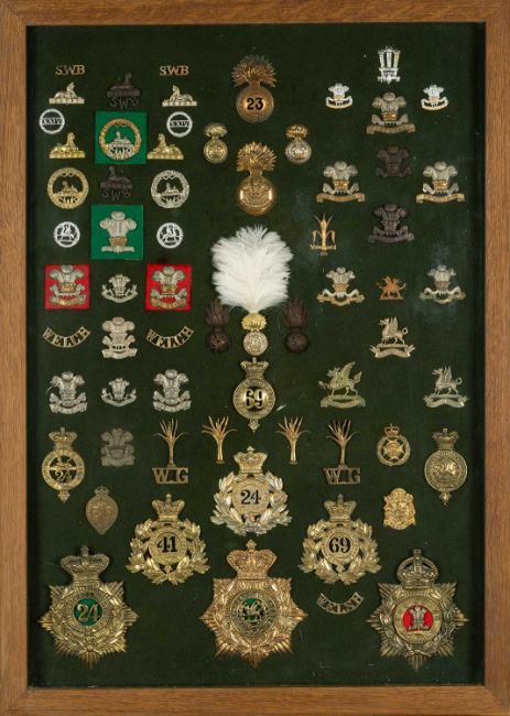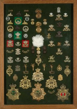 THE MILITARY CLUB HOUSE: REGIMENTAL BADGES including lapel and uniform badges, mounted on green baize, framed and glazed (approx. 100) including Royal Welsh Fusiliers, Welch Regiment, Welsh Guards etcProvenance: private collection West WalesComments: some original, some repressed, viewing advised