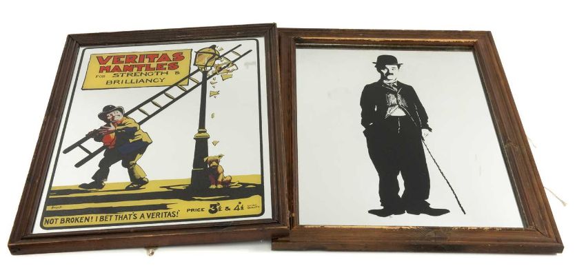 THE DRINKING / ADVERTISING / MEMORABILIA CLUB HOUSE: ASSORTED PICTORIAL MIRRORS including Charlie Chaplin, Snoopy, Veritas Mantles and Fairy Soap, 67cms (h) the largestProvenance: private collection Vale of Glamorgan