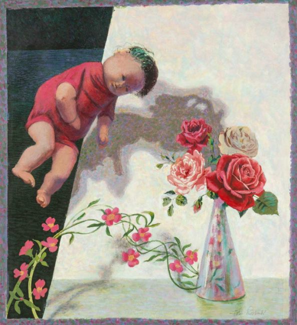 ‡ JOHN VIVIAN ROBERTS (Welsh 1923-2003) acrylic and mixed media - floating doll and roses, signed, circa 1984, 55 x 50cmsAuctioneers Note: from the darkly surreal 'Odd Companions' series of artworks that explore disturbing juxtapositions of mannequins, plastic flowers, graffiti-covered dolls and childhood drawings. In March 1986 John Roberts wrote, ‘I have always been interested in contrasts, in the bizarre and in strange meetings between objects. When a picture assumes its own identity, as if by magic a small new world is born. That is the excitement of making something that never was.’Provenance: private collection Ceredigion