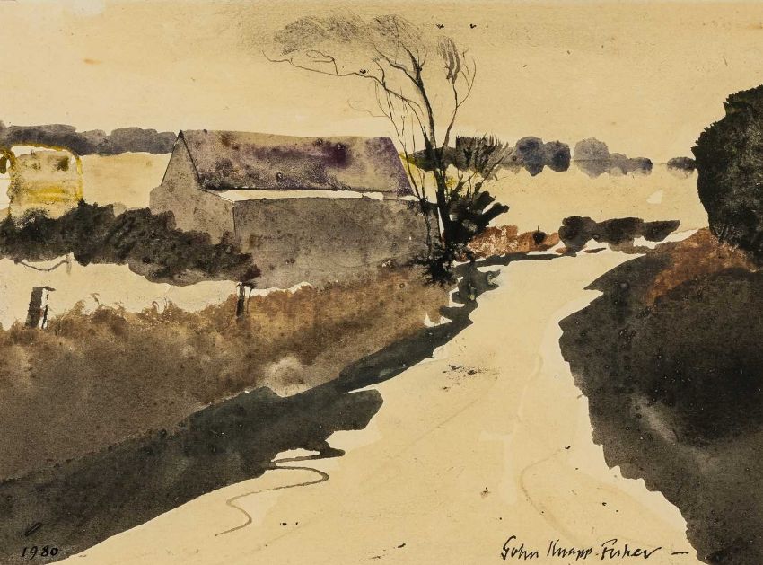 ‡ JOHN KNAPP-FISHER (English, lived Wales 1931-2015) watercolour - country lane with buildings, signed and dated 1980, 14 x 19cmsProvenance: private collection CheshireComments: framed and glazed, ready to hang