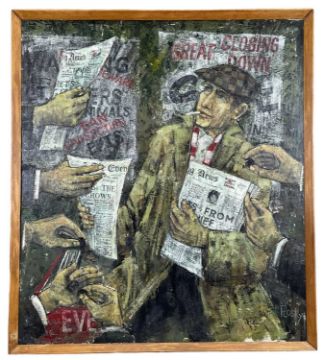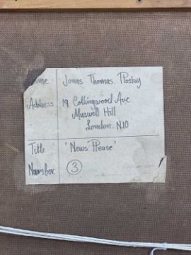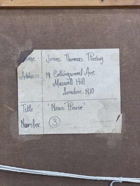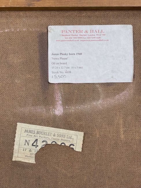 ‡ JONAS PLOSKY (English-European, worked Wales 1940-2011) oil on board - entitled verso, 'News Please' on Planter & Hall Gallery, London label, signed, 85 x 75cmsProvenance: private collection LondonComments: framed, ready to hangFree Delivery: bidders with invoices over £4000 in this Welsh Sale can benefit from free insured delivery to their home (England and Wales only). To enquire about this service, please email brj@rjauctions.co.uk