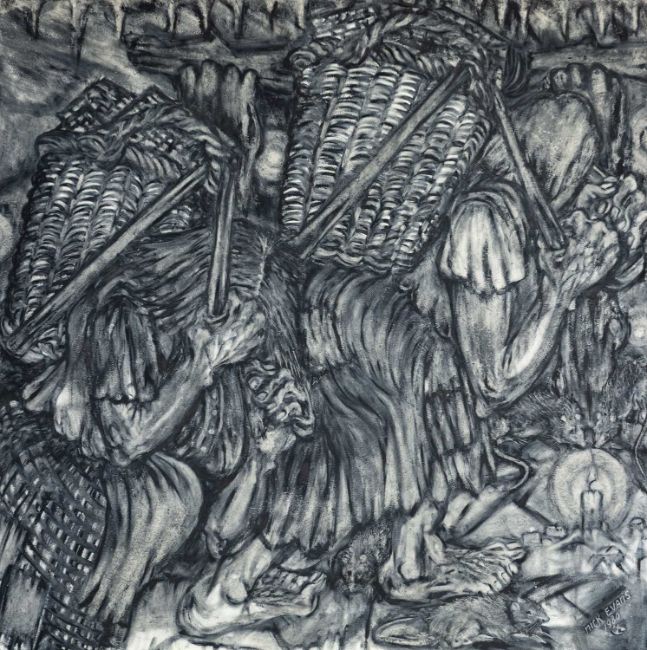 ‡ NICK EVANS (Welsh 1907-2004) large mixed media on board - two bare-footed figures straining under heavy baskets of load, signed and dated 1980, 119 x 119cmsProvenance: private collection SwanseaComments: framed, ready to hangFree Delivery: bidders with invoices over £4000 in this Welsh Sale can benefit from free insured delivery to their home (England and Wales only). To enquire about this service, please email brj@rjauctions.co.uk