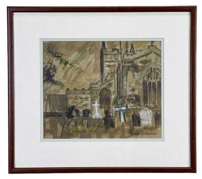 ‡ GWILYM PRICHARD (Welsh 1931-2015) mixed media on paper - church with graveyard, signed, 25 x 30cmsProvenance: private collection HerefordshireComments: framed and glazed, ready to hang
