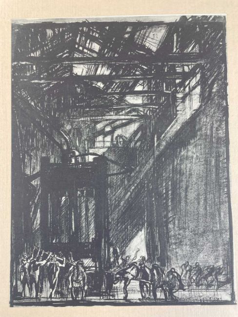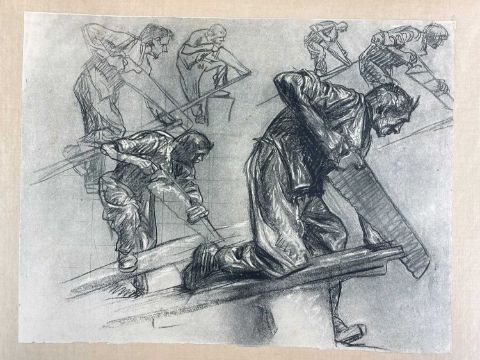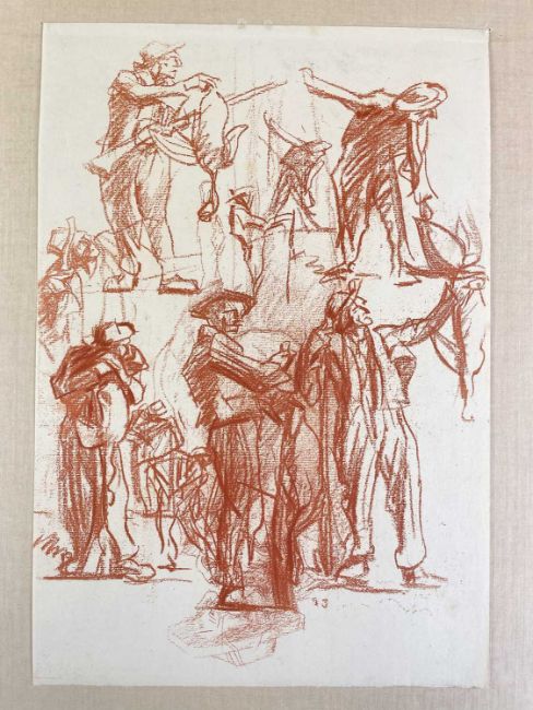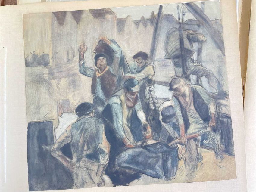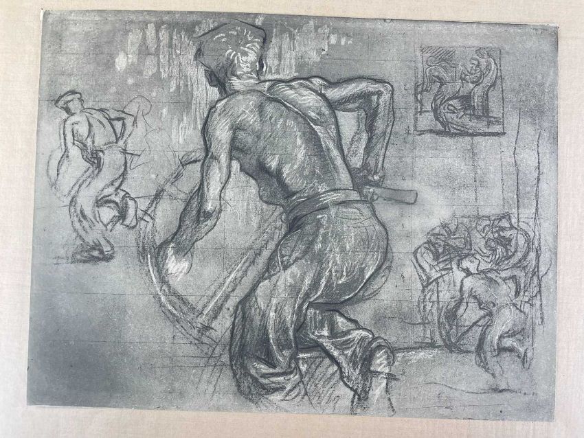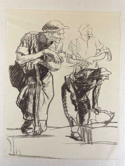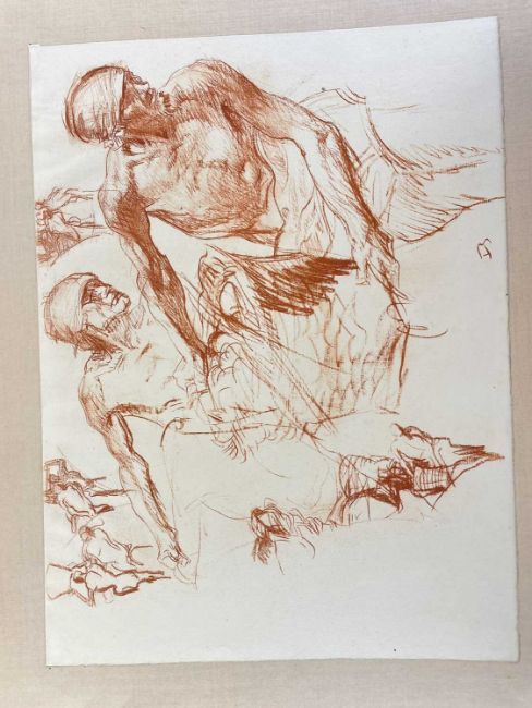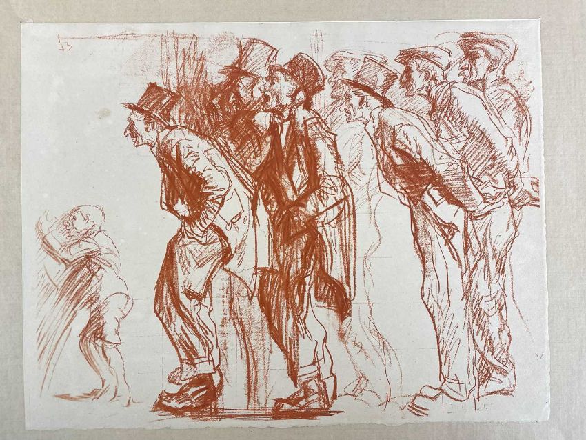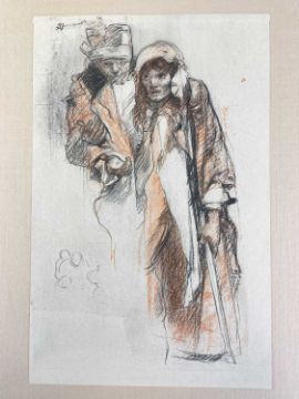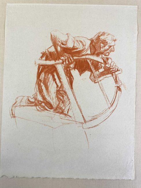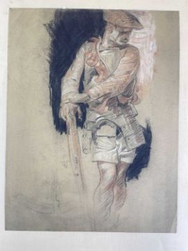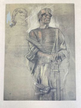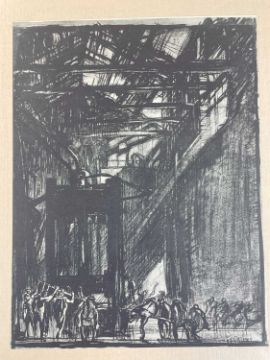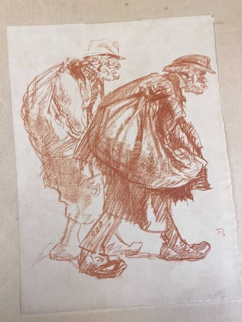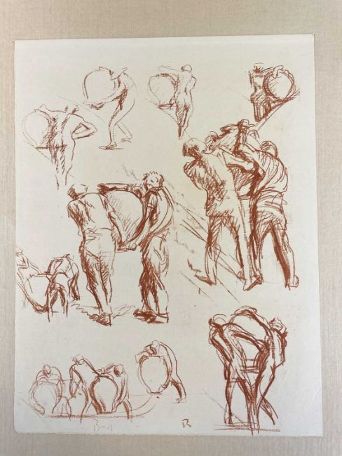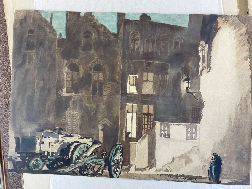 SIR FRANK BRANGWYN RA HRSA RSW RWS PRBA RE HRMS ROI (Welsh 1867-1956) The Brangwyn Portfolio of lithographs, 1927, published by E F d'Alignan and Paul Turpin, to include 'Two Wounded Soldiers', 'Two Men Leaning on Their Adze', 'Blind Beggar', 'Two Indians Leaning on Poles', 'Sketch of St. John', etc., various sizes mounted on card (contained in an original portfolio), smallest 28 x 28cms to largest 45 x 28cms (38)Provenance: private collection SwanseaComments: folio case with tears to spine, and upper left margin to cover, one with auction label, one with scuffs to upper margin, incomplete, inspection advised, all prints photographed