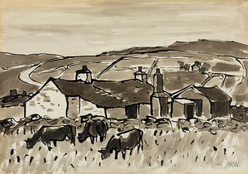 ‡ SIR KYFFIN WILLIAMS RA (Welsh 1918-2006) ink wash - farmstead 'Y Lon Wen' with cattle in the foreground, signed with initials, 28 x 40cmsProvenance: private collection GwyneddComments: framed and glazed, ready to hangFree Delivery: bidders with invoices over £4000 in this Welsh Sale can benefit from free insured delivery to their home (England and Wales only). To enquire about this service, please email brj@rjauctions.co.uk