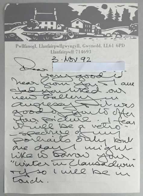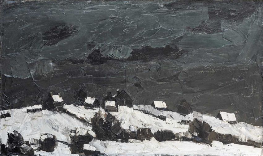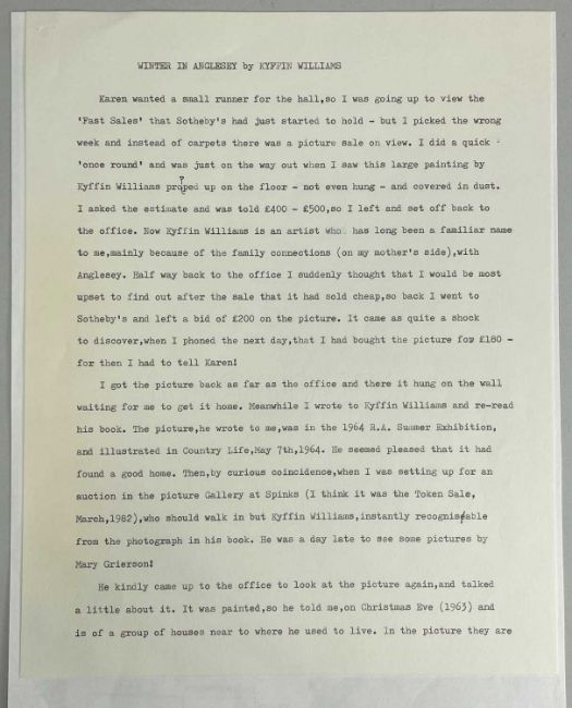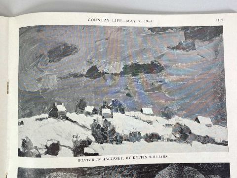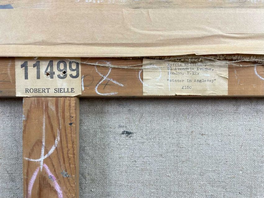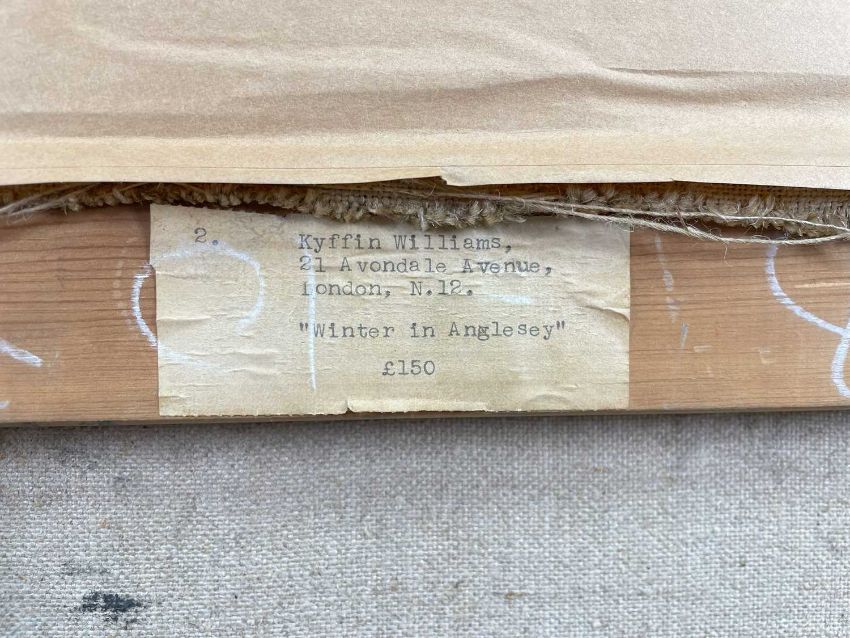 ‡ SIR KYFFIN WILLIAMS RA (Welsh 1918-2006) large oil on canvas - printed title verso 'Anglesey in Winter' on artist's London address (Avondale Ave), 77 x 126cmsProvenance: private collection Surrey, RA Summer Exhibition 1964, same ownership since purchase at Sotheby's in 1981, Sothebys receipt to accompany together with typed letter by owner recalling the circumstances of the purchase including a chance meeting with the artist, also to accompany a copy of Country Life, May 7, 1964, with an image of the painting in their review of the recent Royal Academy exhibition in which the painting, one of two by the artist, is described as '...exceptionally moving representations of the pictorial quality of frigid hillsides'Auctioneer's Note: the subject matter is the village of Llansadwrn, Anglesey which is the village of Sir Kyffin's ancestry for 300 years, it was according to correspondence, painted on Christmas Eve in 1963, verso the label for framer Robert Sielle who was Sir Kyffin's framer in LondonFree Delivery: bidders with invoices over £4000 in this Welsh Sale can benefit from free insured delivery to their home (England and Wales only). To enquire about this service, please email brj@rjauctions.co.uk